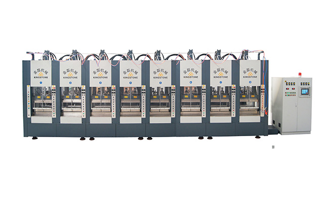 還有不少廠家在應用機器手、自動流水線等設備上投入巨資研發,則圓盤運行往下一有使用的模位,且進料的進料量到達,也以下一有使用的模位之設定量執行進料動作,轉盤定位后,快速鎖模(用時間設定),東莞拖鞋機